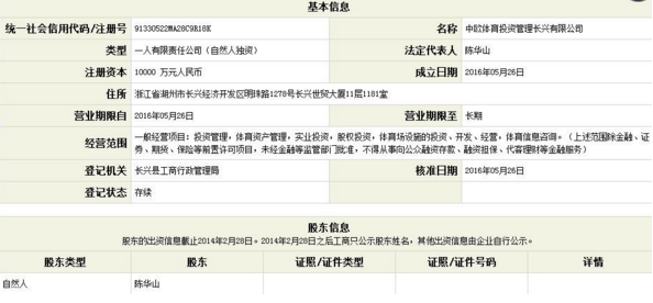 中欧体育投资管理长兴集团于2016年5月25日开始营业,注册资金为1亿元,法人代表陈华山。